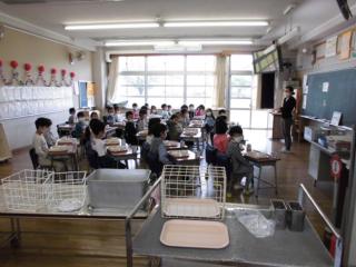 4月18日より、1年生も給食を食べ始めました。6年生のお兄さんお姉さんも応援に来てくれ、スムーズに準備し、おいしく食べて、きれいに片付けることができました。