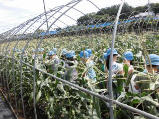食育(国語、生活科)の学習で、碧山小の北側、碧山森の隣の都築農園に行きました。都築さんが目の前で新種の甘いトウモロコシを一人一人に収穫してくれました。収穫の後、たくさんの質問に答えていただき、トウモロコシのことがよくわかりました。 「甘くておいしかった。」というとってもおいしい素敵な学習となりました。都築さんありがとうございました。
