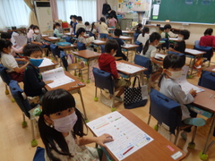 1年生は算数で「どちらがおおい」の学習をしています。形の違うペットボトルが二つあり、どちらの方が多く水が入るのか班で協力して調べました。この日は、片方に水を入れて、もう片方に入れ替える直接比較の方法で調べています。どの班もみんなで協力して、上手に比べていました。
