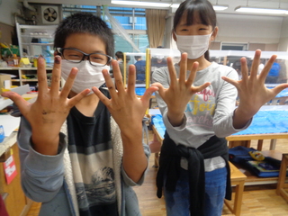 5年生が版画の学習をしていました。すると、左側の男子の手がカラー(紺色)で全面(手首から先は全部です。)塗られていました。「何をしているの?」と私が聞くのと同時に、男子が「見て見て!」ととても嬉しそうにその手を見せてきました。私は「その手、すごいな。洗うの大変やな。綺麗に洗いや」と言って、一旦教室を離れました。