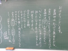 始業式では5年生の児童代表のみなさんが2学期の抱負を立派に話してくれました。各教室では夏休み中の話に花が咲くとともに、2学期の係決めや席替えなどクラスづくりが進められていました。明日からは給食が始まります。また、3年生のみなさんが近くの農家へ枝豆の収穫体験に出かけます。今学期も体験学習を大切に、そこから感じられるものを大切に学習を進めてまいります。