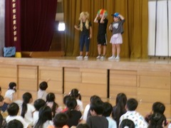 写真左 児童集会の様子 集会委員のみなさんが楽しい企画を考えてくれました