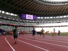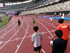 今日は5年生のみなさんと国立競技場へ行ってきました。国立競技場と言えば今、まさに世界陸上が行われている、数々のドラマが生まれているあの場所です。そして、ただ行ってきただけではありません。室内練習場やフィールドのトラックを利用して、これまでのオリンピックや世界陸上で日本代表として参加した方々から直接走り方やとび方の指導を受けることができたのです。この募集が東京都から来たのは今年の2月上旬。見た瞬間東小の子たちを連れていきたいと思ったことを覚えています。対象は4年生以上だったのですが、現4年生と6年生は劇団四季に申し込んでいたことと、現6年生は昨年度FC東京の選手との交流を経験できたことから、迷いなく新5年生で申し込もうと、すぐに準備を始めました。当選通知が来たのは5月も半ばになってからのことでしたが、往復のバスも都が手配してくださり、何より子どもたちには国立競技場のフィールドに立てるというプレゼントをすることができました。国立競技場は陸上競技はもちろん、サッカーやラグビーなど様々なスポーツが行われている場所です。スポーツへの興味関心を高めてほしいと同時に、今日の経験を自分自身のこれからに生かしていってほしいと思っています。