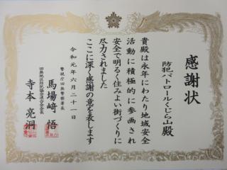 いつも東伏見小学校の子供たちを見守ってくださる「くじら山」が表彰状をいただきました。