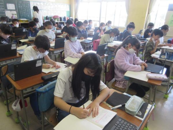 ノートに自分の考えを書きます。机の上には、筆箱、そして新しい文房具のタブレット。