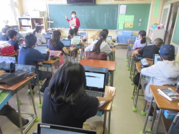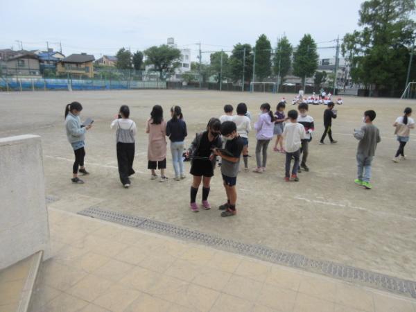 タブレットでの活動の紹介が多くなっています。写真は今週の5年生の体育「走り幅跳び」の様子です。はじめの記録を取り、記録が伸びるための工夫をしています。踏切板を活用して、遠くではなく高く跳ぶ感覚を味わわせています。片足踏み切り、両足で安全に着地、7歩か9歩の助走など、みんなで高め合っています。