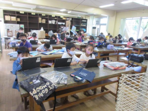 丂庼嬈偺廔傢傝偛傠偺帪娫丅恾岺偺奊傪採弌偟偨巕偐傜弴偵丄僞僽儗僢僩傪妶梡偟偰丄偍奊昤偒僜僼僩傪懱尡偟偰偄傑偟偨丅