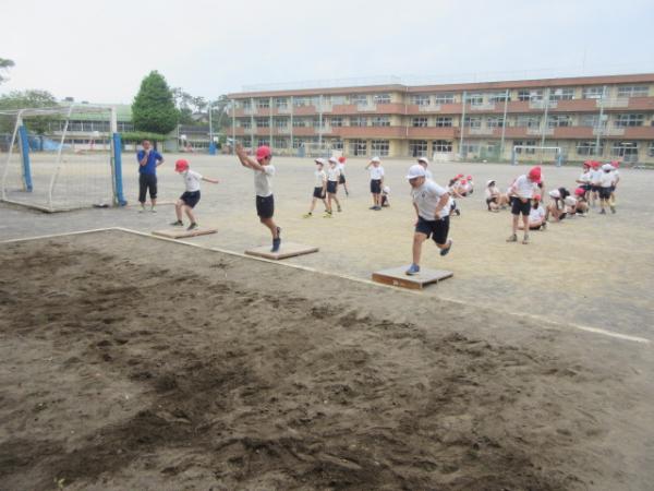 次に踏切板を使って、片足踏み切りと高く跳ぶ練習