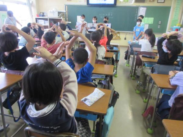 緊急事態宣言発令中のため、今朝は5年1組よりタブレット生中継。集会委員会の児童が〇×クイズをしてくれました。