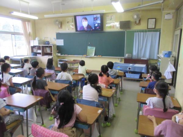 月曜朝会 6年生代表挨拶 1年2組よりタブレット生中継