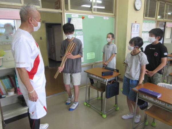 聖火リレーのサポートランナーを担当する予定だった児童と西東京市聖火ランナー早乙女勇一さんがタブレットで生出演しました。早乙女さんは、本校の卒業生です。可愛い後輩のために、貴重なトーチを持って、ランナーの衣装を着て、来てくださいました。早乙女さんへの応援メッセージは6年生が作成しました。