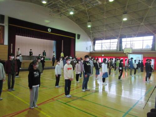 運動会のダンスをもう一度。例年より2週間遅れの開催となったので、体育館は卒業式の紅白幕が準備されています。