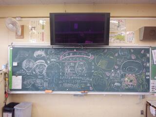 いくつかの学級では、お楽しみ会に向けて黒板アートを行っていました。先生が書いたもの、子どもたちが書いたものなど種類は様々ですが、年度末をみんなでお祝いしようという明るく、元気な思いが伝わってきます。