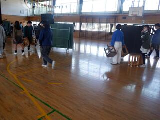 展覧会に向けて、今日は6年生たちが体育館の清掃や台座などの設置作業を行いました。