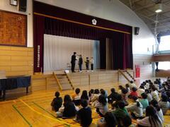 絵の作品展とむくのきまつりの表彰を行いました。また、校長先生からは学校生活を楽しむために嫌なことがあったら言ってよいこと、相談シートも活用して相談することができることについてお話がありました。