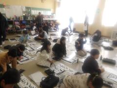 今日は4年生が床に書き初め用紙を広げて頑張っていました。
