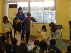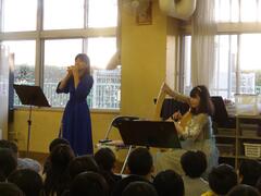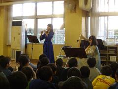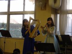 フルートとハープの奏者お2人にご来校いただき、演奏を聴かせていただきました。フルートだけでなく、オカリナやアイルランドの民族楽器ティンホイッスルの演奏もしていただきました。また、代表の子どもたちがハープの体験もさせていただき、とても素敵な体験ができました。
