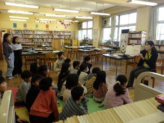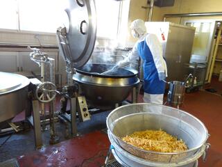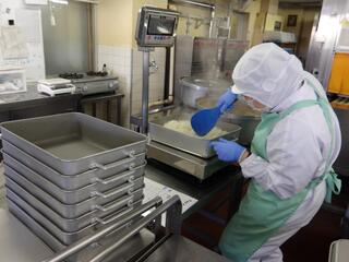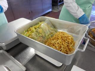 給食室の様子を紹介します。6年生リクエストのぱりぱりポテトサラダを作っているところです。大きな鍋でたくさんのポテトを揚げています。ご飯は体重計のような秤を使って、クラスごとに分けています。