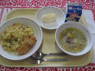 クッパは韓国の雑炊です。ご飯にスープをかけて食べます。給食では豚骨からとったスープです。