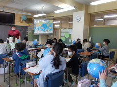 離任式終了後の6校時に、離任された先生方には関わりのあった学年の教室を回っていただきました。子どもたちから歓声が沸き、先生方は質問攻めにあっていました。進級した子供たちの成長した姿を見て頂くことができ、楽しいひと時となりました。
