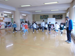 今日は田無警察の方にご来校いただき、1年生の「歩き方教室」を実施しました。とても分かりやすく話をしていただき、体育館内に信号機や横断歩道を設置して実際の歩き方も教えていただきました。