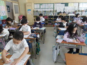 さて、今朝は毎月恒例の学習イベントデー。研究主任の松葉先生が中心となり、学習計画を立ててプリントを用意しています。児童が興味をもって取り組める内容になっており、結構難易度が高いプリントもあるため、余計に張り切る子供たちです。ちなみに今月の内容は、1年ひらがなプリント、2年ぬりえ九九、3年熟語パズル、4年都道府県クイズseazon2、5年都道府県クイズseazon1、6年都道府県名あてプリントです。副校長先生の放送で全校一斉に開始!本校児童の学力が向上しているのは、このように定期的に基礎学力を確認し集中力を鍛えていることも一因かもしれません。地図帳やタブレットで調べながら問題を解いたり、タブレット上にある回答で答え合わせをしたりと、端末も活用しながら取り組んでいます。