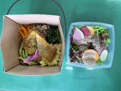 昨日の9/1は給食のない日でした。そこで、田無にある「おべんとう道ーMICHIー」さんに注文して、「ハンバーグランチ(小賀坂さん考案)」と「ガパオライス(三浦さん考案)」を届けていただき、お昼に全教職員で食べました。めぐみちゃん事業は本当は8/31までの取組なのですが、「お弁当道ーMICHI」さんと本校職員が繋がりがあり、特別に作ってくださったのです。