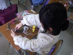 リースの飾り付けでは、用意してきた飾りを「どこに付けようかな?」「ここには、〇をつけて、こっちには〇〇をつけよう!」など考えながら、装飾しました。作ったリースは、ホールでしっかり乾かし、一人一人袋に入れて持ち帰りました。