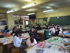 この日は、図工室で「わっかでへんしん」の学習をしました。画用紙、色紙、スズランテープなどを使って、自分に身に着けるわっかを作ります。どんな風に変身したいかを考えながら、ベルトや髪飾り、アクセサリーなど、思い思いにわっか作りを楽しんでいしました。作品作りを進める中で、子供たちはいろいろな工夫を取り入れていました。