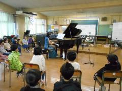 ピアニストの古川佳園さんをお招きして、音楽鑑賞教室を行いました。子どもたちは1曲ずつ先生の解説を聞いた後、普段、聞くことのできない生の演奏を夢中で聞いていました。また、最後には「勇気100%」の演奏に合わせて手話で一緒に歌い、楽しい時間を過ごしました。