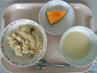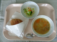 ★今日のポタージュには3種の野菜が使われています。「じゃがいもは絶対入ってる!」「にんじんの味がするかも?」と予想しながら味わってくれて嬉しかったです。
