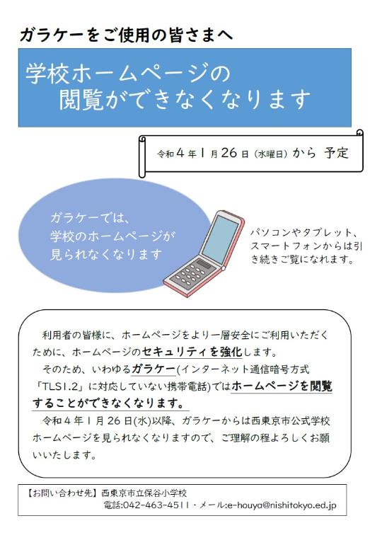 西東京市教育委員会による学校ホームページのセキュリティ強化に伴い、令和4年1月26日以降、古い機種の携帯電話などの一部において、学校ホームページを閲覧することができなくなりますのでご注意ください。パソコンやタブレット、スマートフォンからは引き続き閲覧可能です。