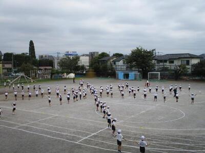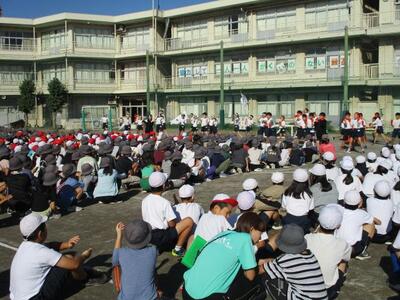ここ数日さわやかな天気が続き、夏の暑さも一段落したようです。スポーツデーまで、あと一か月となりました。今日の体育朝会は体操の隊形の練習をしました。高学年は経験があるので、さっと隊形移動ができますが、低学年は周りの動きを見ながら隊形移動の練習をしました。本番では、練習の成果を生かして全校児童がさっと動けるようにこれからも練習を続けていきます。