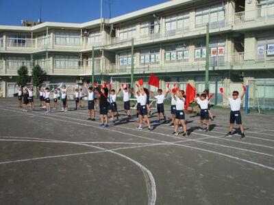 今日は体育朝会がありました。スポーツデー前ということで、内容は応援合戦の練習でした。応援団は今まで放課後や休み時間を使って練習をしてきましたが、全校児童の前で応援合戦をするのは初めてでした。団長の「応援合戦いくぞー」り掛け声に全員が声を合わせて、応援合戦が始まると、全校児童は大盛り上がりで声を出していました。本番まであと1週間、これからも練習を重ね、本番ではかっこいい応援団の姿をご覧ください。