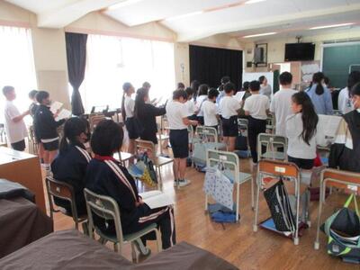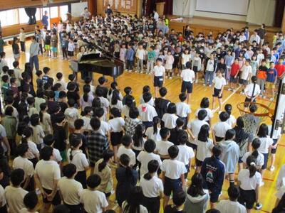 今日は音楽朝会がありました。スポーツデー前ということで、音楽委員会と応援団の子どもたちが中心となって「スポーツデーの歌」を全校児童で歌いました。体育館に響き渡る全校児童の歌声はとても元気がよく、スポーツデーを楽しみにしている様子が伝わってきました。本番まで、あと2週間ほどですが、これからも精いっぱい練習をしていきたいと思います。