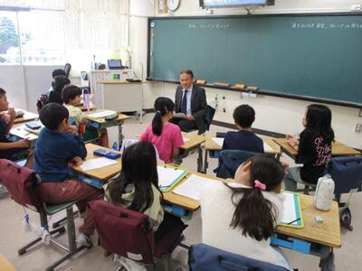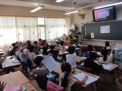 3年生が外国語活動の授業をしていました。今日はネイティブの先生が来ているので、担当の先生と2人で指導をしています。アルファベットについての学習でしたが、どの子も先生の発音をよく聞き、一生懸命にカードを探していました。子どもの耳はとてもよく、大人になるとなかなか分かりにくい発音もしっかりと聞き分けていました。外国語活動の時間はできるだけたくさんの時間、英語に触れ、英語を体全体で感じてほしいと思います。