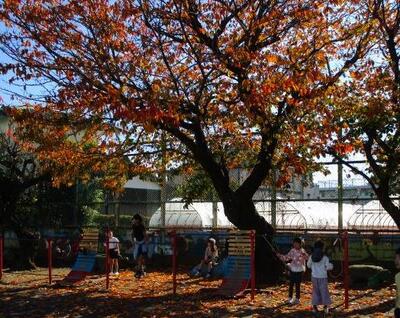 昨日の寒さとは一転して、今日はとても暖かく、真っ青な空に心地よい日差しが差し込み、休み時間の校庭も多くの子どもたちでとてもにぎわっていました。ふと、校庭の木々を見ると、すっかり色づき、サクラの葉は赤にイチョウの葉は黄色になってきています。校庭の様子から季節を感じることができるのも学校のよさの一つです。