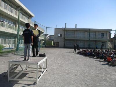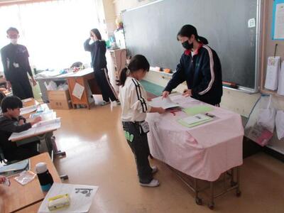11月27日と28日の2日間、青嵐中学校の2年生(本校の卒業生)が職場体験にきました。小学校の先生の仕事を体験し、すべての学年の授業に入ったり、行事の準備を手伝ったりしてくれました。低学年の算数の授業では、ミニ先生になって○付けを手伝い、休み時間には子どもたちと一緒になって校庭で遊んでくれ、子どもたちにも大人気でした。