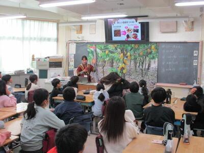 今日は5年生が「(株)明治」による出前授業を受けました。これは食育の授業の一環で「チョコレート」という身近な食品を通して、自然の恵みやカカオ農家の仕事、国際協力について楽しく考えるプログラムです。