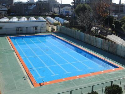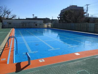 2学期から行っていたプール槽の改修工事が終了し、水を入れ替えてきれいなプールになりました。安全にも配慮して、プールサイドも目立つオレンジ色で滑りにくい素材に変えました。新しい水の入ったプールの水面は昼間の日差しに反射して、きらきらと輝き、生まれ変わったプールが喜んでいるようにも見えます。