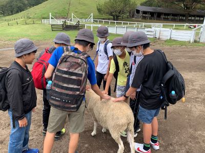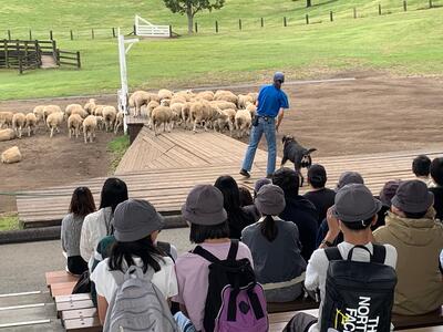 6年生は予定通り、伊香保グリーン牧場に到着しました。早速、シープ&ドッグショーを鑑賞しています。広い牧場に散らばっている羊たちを、牧羊犬が吠えたり走ったりして素早く集める様子を見ました。牧羊犬のいろいろな技に歓声があがり、大きな拍手で盛り上がりました。羊の毛刈りについて説明を聞き、これからふれあいの時間です。