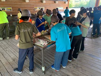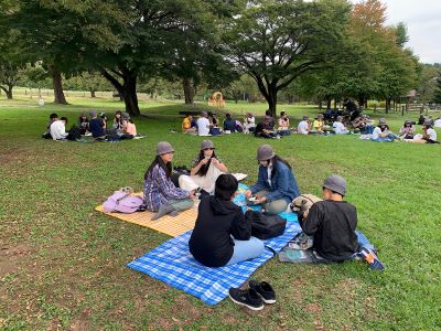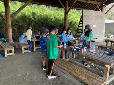 涼しくて気持ちのよい風が吹いている広場で、お昼を食べました。友達と楽しく話しながら、おにぎりと唐揚げをほおばっていました。昼食後は、自由行動をしながらハンターゲームを行います。