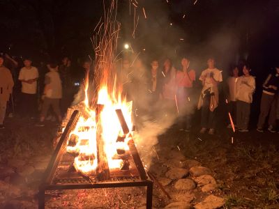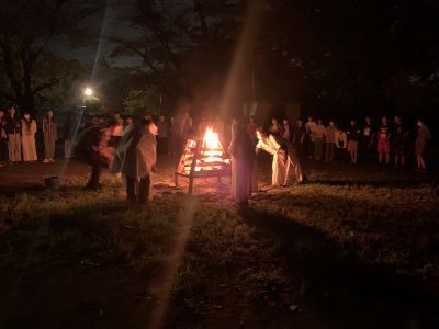 夕食をとってお腹がいっぱいになった頃、あたりはすっかり暗くなりました。火の神を呼び、いよいよキャンプファイヤーの始まりです。暗闇でのキャンプファイヤーを見て、「きれー!すごーい!」の声が聞こえました。キャンプファイヤーを囲んで、みんなで歌ったり、ゲームをしたりしました。炎を前に踊ったソーラン節は、掛け声も大きく気合いが入っていました。