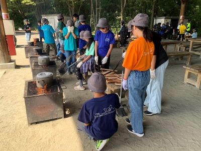 かまどで火をおこし、野菜を切って、カレー作りに挑戦しました。どの班も真剣に取り組み、カレーが出来上がりました。自然の中で友達と食べるカレーは、とても美味しかったです。