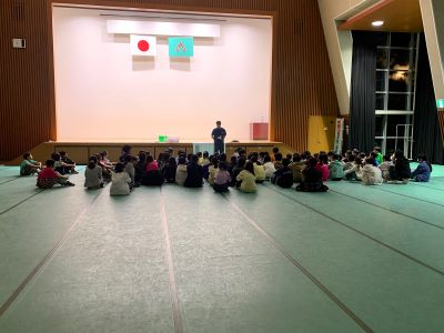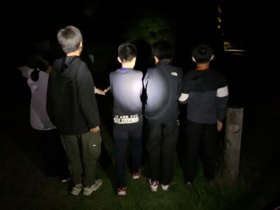 夕食を終え、今日の夜はナイトウォークです。午後のアドベンチャーラリーで歩いた道ですが、夜に歩くと雰囲気がずいぶん違います。講堂に一度集まった後、班ごとに出発しました。昼間みんなで賑やかにカレーを作った場所が、夜は虫の声が響く暗闇に変わっていて、驚いたり怖かったりしたようでした。懐中電灯を片手に、自然の中の夜を味わいました。