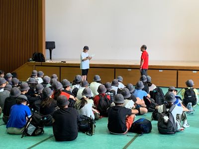 2泊3日お世話になった部屋から荷物を運び、使った場所を掃除して宿舎にお別れです。退所式では、国立赤城少年の家の方にお世話になったお礼と感謝をお伝えしました。バスに乗って、自然史博物館を目指します。バスの中でも元気いっぱいの子ども達は、バスレクのイントロクイズにたくさん手を挙げています。