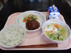 始業式から3日目、2年生から6年生までの給食がスタートしました。本年度最初の給食は「ごまご飯」「チーズハンバーグ」「ごぼうとツナのサラダ」「むらくも汁」そして「牛乳」です。栄養士から年度最初の献立なので、「主食」「主菜」「副菜」のそろった栄養バランス満点メニューだと紹介がありました。