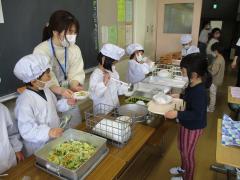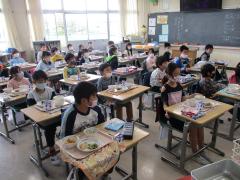 写真で様子が分かるでしょうか。黒板前にカートを出して、給食当番は食器を使って給食を配る真似をします。また、もらう側は自席にナプキンを置いて、きちんと並んでお皿から受け取り、その後、少しずつ進んで他の食器も受け取ります。このようなことをしながら「いただきます」までどの様な流れになるかを子どもたちは理解します。見ていると給食をもらった子どもたちは、自分の席できちんと待っています。昨年度から感染症対策で、全員が一方を(1年生は黒板の方を)向き、席をはなして食べます。一昨年までは机を合わせて班の様にして食べていましたから様子は全く違います。お話もできません。放送委員会が流してくれる音楽やクイズを聴いたり、時には行事のビデオなどを見たりしながら食べています。本来、友達との会話を楽しみながら食べる給食です。以前の様な給食になる日が早く来てほしいものです。