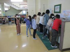 その後、給食準備中に、1年生を中心に教室を見て回りました。1年生もすっかり給食に慣れています。また、静かに過ごしながら給食の配膳をおこなっていました。あるクラスでは、給食を受け取る前に各自が手指消毒を行う姿が見られました。また、廊下で距離をとって並んでいる子どもたちもいます。コロナ禍でリスクが高い食事ですが、子どもたちはよく頑張っています。