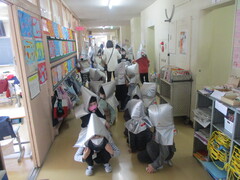 今朝は朝の時間を使って避難訓練をしました。全校が集まることはせず、教室前に避難をして人数確認をしました。静かに避難できている様子が見られました。
